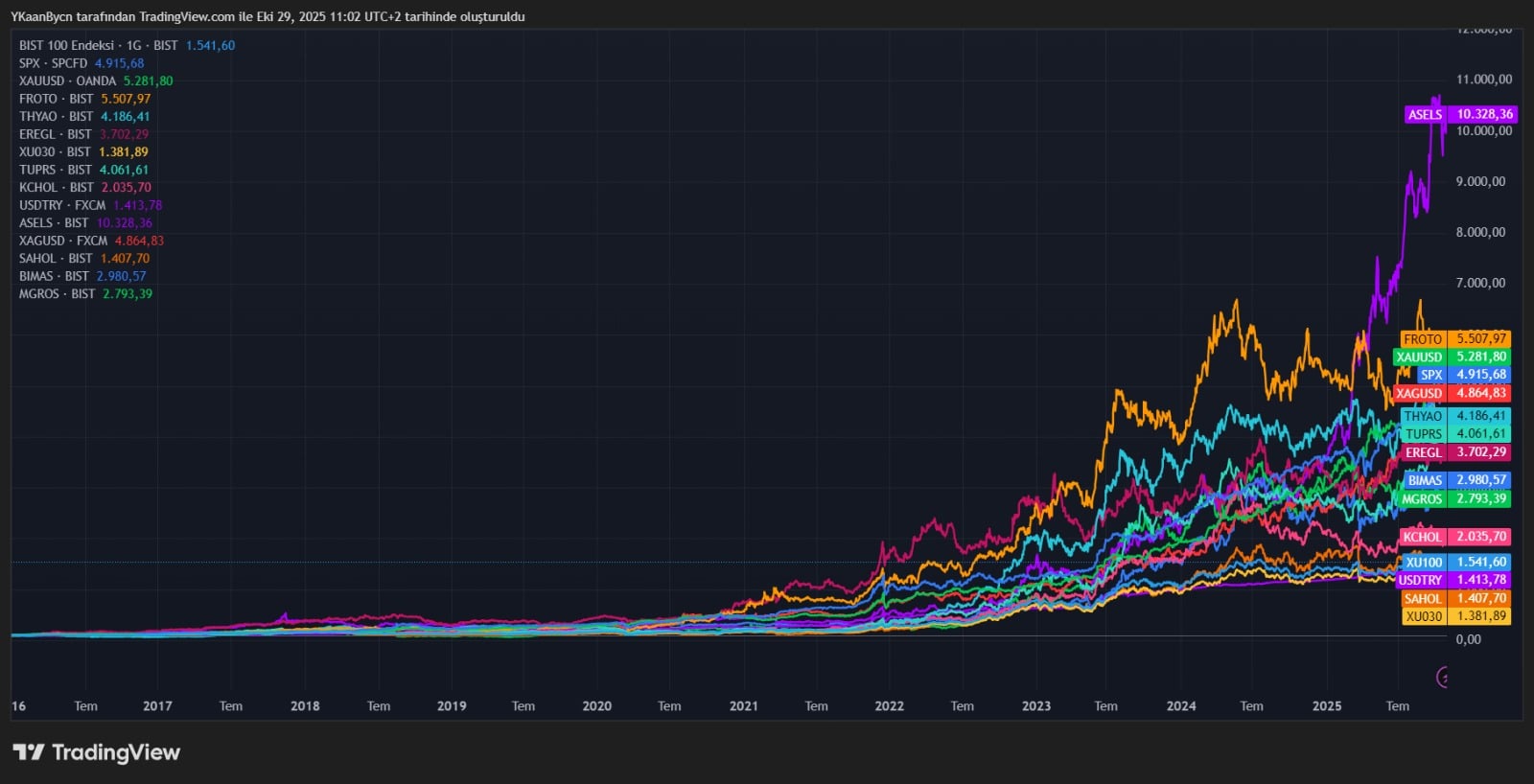 Yukarıdaki grafikten de anlaşılacağı üzere, rallileri kaçıran bir Aselsan yatırımcısı 10 yıllık süreçte altını yenebilen tek yatırımcı konumunda. Diğer hisseler incelendiğinde ise, altına ve gümüşe en yakın şirket olarak konumlanan FROTO dahi %48’lik bir farkla dezavantajlı konumda bulunmaktadır. Sıralamanın en altında yer alan EREGL ise, altın karşısında %811’lik bir farkla ciddi değer kaybı yaşamaktadır. Savın “uzun vadede hiçbir yatırım aracını geçemez” kısmını bu grafikteki araçların çoğunluğunun geride kalışıyla haklılığı gözlemlenmektedir